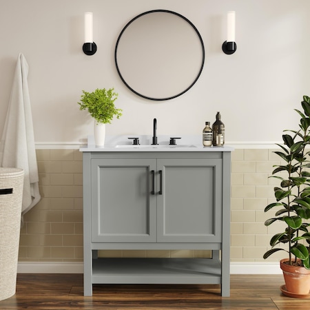 Vega 36in. Vanity w/Sink, Cabinet w/Gold Hardware, Open Shelf & 3 Drawers, Marble Counter, Gry/Wht