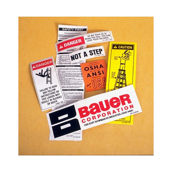 This kit includes the seven standard labels used on all Bauer fiberglass extension ladders.The customer must include the model number of the ladder with the order. This maintains compliance with OSHA/ANSI labeling requirements. For Bauer ladders only.
