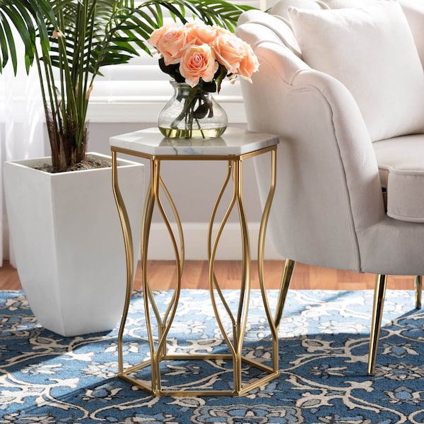 Give your space a beautiful yet practical accent of modern design with the Kalena end table. Made in China, this lovely piece is comprised of a solid metal base topped with a clean marble tabletop. The base features a smooth openwork design that allows light to flow more easily throughout the room. The Kalena will arrive fully assembled and utilizes a hexagon-shaped tabletop with crisp angles that exude geometric charm. A convenient and compact addition, the Kalena injects modern glamour to any interior space.
