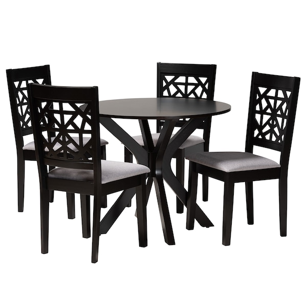 Intricate design unites with modern comfort in the Karel dining set. Made in Malaysia, this modern set includes four chairs and one table crafted from sturdy wood. Each chair features a plush foam-padded seat, as well as a geometric cut-out design on its back. The Karel requires assembly and features a circular tabletop with smooth edges that provide superb space for each member of the table. Playing a central role for both casual and formal occasions, the Karel dining set serves as a wonderful centerpiece in any arrangement.