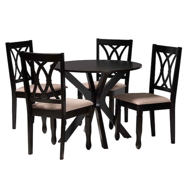 Cultivate an air of sophistication in your dining room with the stunning Maya dining set. Made in Malaysia, the set includes four dining chairs and one table constructed from sturdy wood. Each chair is fitted with a foam-padded seat and upholstered in smooth fabric as well as a captivating cut-out design on the backrest. Requiring assembly, the large, circular tabletop ensures plenty of elbow room for each member of the table. Demonstrating unique yet refined craftsmanship, the Maya dining set brings elegance to any dining room.