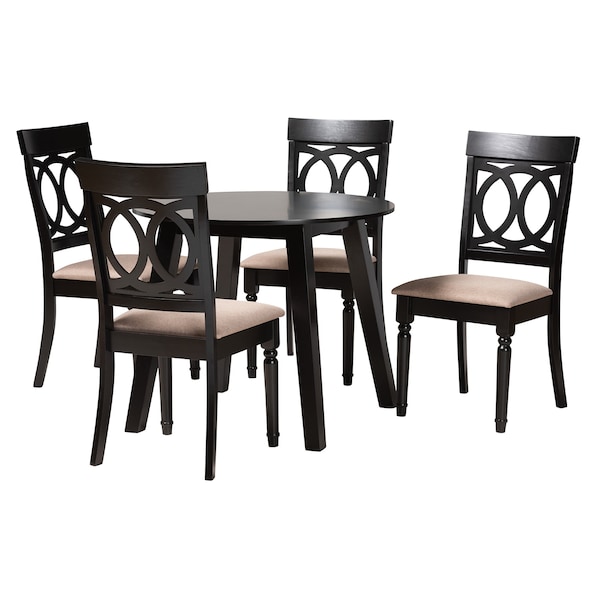 Featuring a modern profile, the Charlotte dining set brings a chic aura to any arrangement. Made in Malaysia, this sleek set includes one table and four dining chairs constructed from sturdy wood. Each chair is padded with foam and upholstered in soft fabric for superb comfort, while the lovely cut-out backrest lends smooth geometric appeal. The Charlotte requires assembly and features a round tabletop to ensure ample space for each member of the table. Lending an elegant display from any angle, the Charlotte dining set is sure to elevate any occasion.