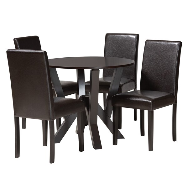 Elevate the mood of any occasion with the remarkable Rosi dining set. Made in Indonesia, this modern set includes four chairs and one table crafted from sturdy wood. Each chair is padded with plush layers of foam and upholstered in smooth faux leather for a sumptuous embrace in chic design. The Rosi requires assembly and features a round tabletop with graceful curves to accommodate each member of the table. The intersecting base of the table creates a striking display from every angle, making the Rosi dining set an exquisite focal point of any arrangement.