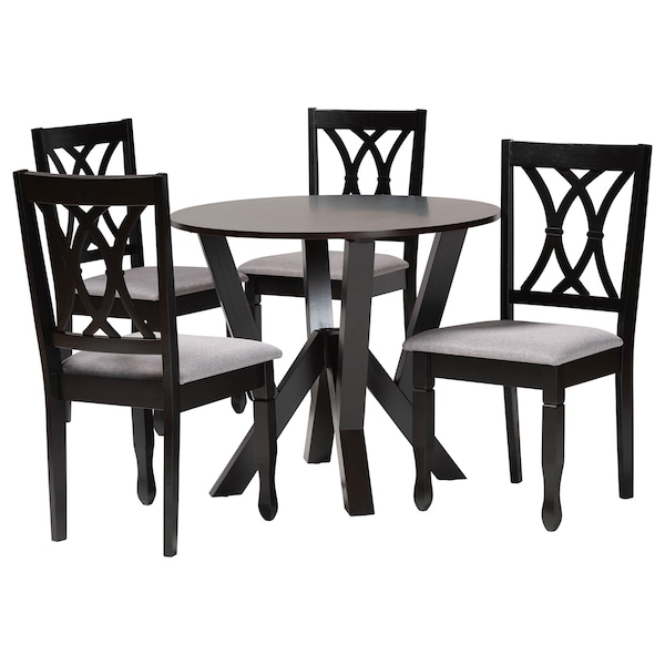 Elevate your dining space with the sophisticated elegance of the Irene dining set. Made in Malaysia, the set includes four dining chairs and one table constructed from sturdy wood. Each chair is fitted with a foam-padded seat and upholstered in soft fabric. Requiring assembly, the broad, circular tabletop ensures plenty of elbow room for each member of the table. Radiating contemporary style, the Irene dining set is an excellent addition to any home.
