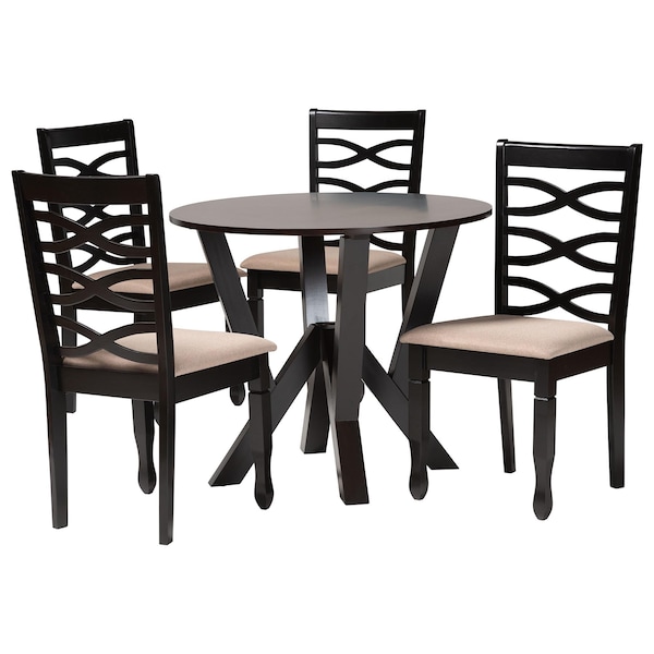 Sophisticated design joins modern comfort with the stunning Ariane dining set. Made in Malaysia, the Ariane includes four dining chairs and one table crafted from sturdy wood. Each chair is equipped with a plush foam-padded cushion for superb comfort and features a unique cut-out design on its backrest. Requiring assembly, the circular tabletop provides ample elbow room for each member of the table. Spade feet add a classic touch, making the Ariane dining set a timeless addition to any space.