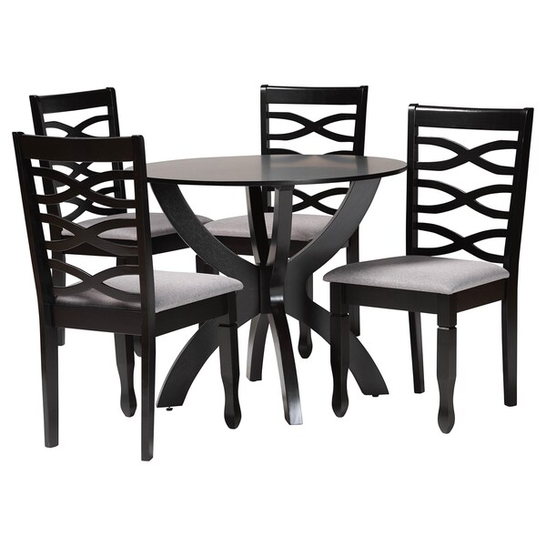 Sophisticated design joins modern comfort in the Aspen dining set. Made in Malaysia, this wooden set includes one table and four chairs constructed from sturdy wood. Designed with both comfort and style in mind, each chair features a plush foam-padded seat, as well as a striking cut-out design on its back. The round tabletop is supported by an intersecting base, creating a chic, sculptural effect. Requiring assembly, the Aspen dining set is well suited for both casual and formal dining.