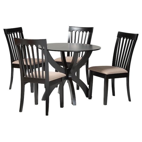 Timeless design is merged with modern comfort in the Bailey dining set. Made in Malaysia, this modern set includes one table and four chairs crafted from sturdy wood. Each chair is fitted with a foam-padded cushion upholstered in soft fabric as well as a striking cut-out design on its back for enhance visual appeal. The Bailey requires assembly and features a circular tabletop that provides ample elbow room for each member of the table. An optimal balance of comfort and style, the Bailey dining set is sure to elevate any dining experience.