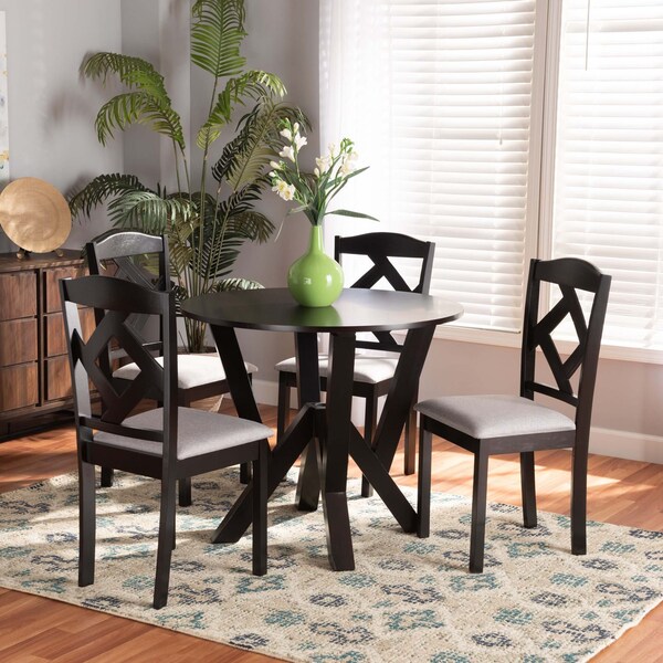 Enjoy everyday meals and friendly gatherings with the Riona dining set. Made in Malaysia, this set includes four dining chairs and one table constructed from wood displaying a rich dark brown finish. Each chair features a plush foam padded seat upholstered in soft fabric, as well as a geometric cut-out design on its back, for a striking blend of comfort and style. Requiring assembly, the wide, circular tabletop provides ample elbow room for each member at the table. Perfect for enjoying nights with friends and family, the Riona dining set elevates any dining experience.