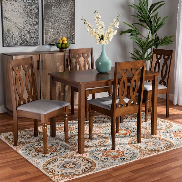 Elegance and comfort define the Cherese dining set. Made in Malaysia, this wooden set includes one table and four chairs. The chairs are upholstered in a light fabric that complements the warm walnut brown wood finish. Designed with both comfort and style in mind, each chair features a plush foam-padded seat, as well as an exquisite cut-out design on its back. Turned legs add a classic, refined touch. Requiring assembly, the large, rectangular tabletop provides plenty of elbow room for each member at the table. Built for long dinners with family and friends, the Cherese dining set is sure to enhance any dining experience.