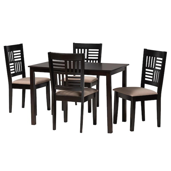 Exuding geometric flair, the Deanna dining set evokes an air of sophistication. Made in Malaysia, this modern set includes four dining chairs and one table comprised of a sturdy wood. Each seat features a plush, foam-padded cushion upholstered in fabric as well as a beautiful slatted wood backrest. The Deanna requires assembly and features a rectangular tabletop with crisp edges to offer ample room for each member of the table. Eliciting sleek serenity, the Deanna dining set elevates any space.