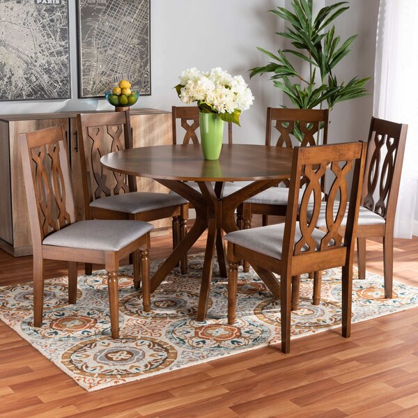 Elegance and comfort come together in the Callie dining set. Made in Malaysia, the Callie includes six chairs and one table constructed from sturdy wood finished in a warm walnut brown. Each chair is fitted with a foam-padded cushion upholstered in a smooth grey fabric and features a unique cut-out design on its back. Requiring assembly, the circular tabletop provides ample elbow room for each member of the table. Ideal for both casual and formal occasions, the Callie dining set easily updates the modern home.
