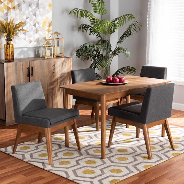 Embrace laidback comfort during meals with the Nexus dining set. Made in Malaysia, this set includes four chairs and one table constructed from wood displaying a warm walnut brown finish. Each chair features a plush foam padded seat and backrest upholstered in smooth fabric for long lasting comfort during meals. Requiring assembly, the wide, rectangular tabletop ensures sufficient elbow room for each member at the table. Delivering plush comfort in a stylish, streamlined design, the Nexus dining set improves any dining experience.