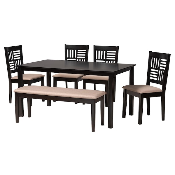 Exuding geometric flair, the Deanna dining set evokes an air of sophistication. Made in Malaysia, this modern set includes four dining chairs, one bench, and one table comprised of a sturdy wood. Each chair features a plush, foam-padded cushion upholstered in fabric as well as a beautiful slatted wood backrest. The Deanna requires assembly and features a rectangular tabletop with crisp edges to offer ample room for each member of the table. Eliciting sleek serenity, the Deanna dining set elevates any space.