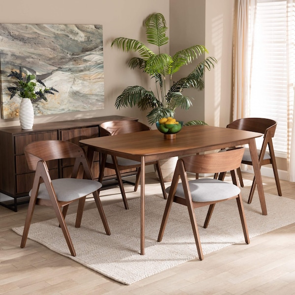 Establish a charming arrangement in your dining room with the modern design of the Danton dining set. Made in Malaysia, this dining set includes four chairs and one table constructed from wood showcasing a warm, walnut brown finish. Each chair features a curved backrest for solid back support, while a plush, fabric upholstered seat brings superb comfort to every meal. Requiring assembly, the set includes a rectangular tabletop designed to comfortably seat four. Angled legs lend a cool, retro look. Creating an expressive display from any angle, the Danton dining set is a stunning addition to any dining room.