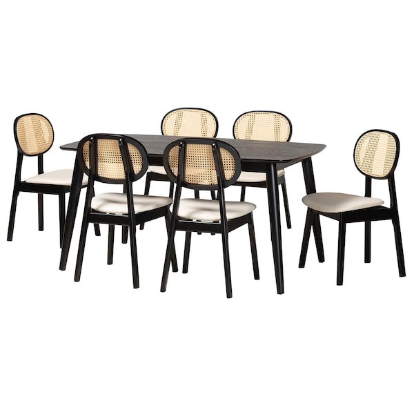 Accumulate an air of traditional elegance in your space with the Darrion dining set. Made in Malaysia, this mid-century inspired set includes six chairs and one table crafted from sturdy wood. Each seat is padded with plush foam and upholstered in soft fabric for a lavish embrace while the round backrests embellished with woven natural rattan create an alluringly cozy display. The Darrion requires assembly and features a rectangular tabletop with rounded corners to provide ample space for each member of the table. Carrying robust personality, the Darrion dining set transforms the feel of any occasion.
