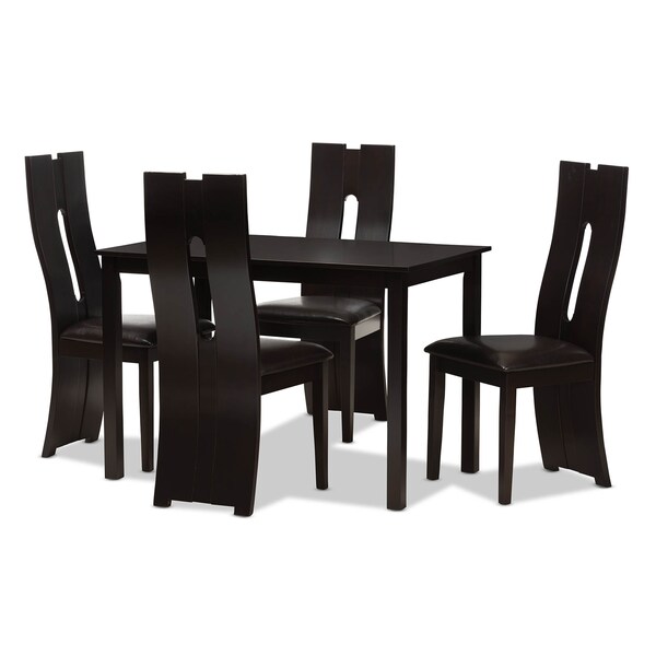 With details not to be missed, the Alani modern and contemporary dark brown faux leather upholstered dining set excites and delights for a truly enjoyable dining experience. This 5-piece dining set features an impressive extra-tall backrest with padded faux leather seats in dark brown. The chair features eye-catching cut-out shape on its bent backrest as an added contemporary style. Sturdily made with solid wood, the chairs are finished with dark brown finishing for a contemporary look. The dining set requires assembly.