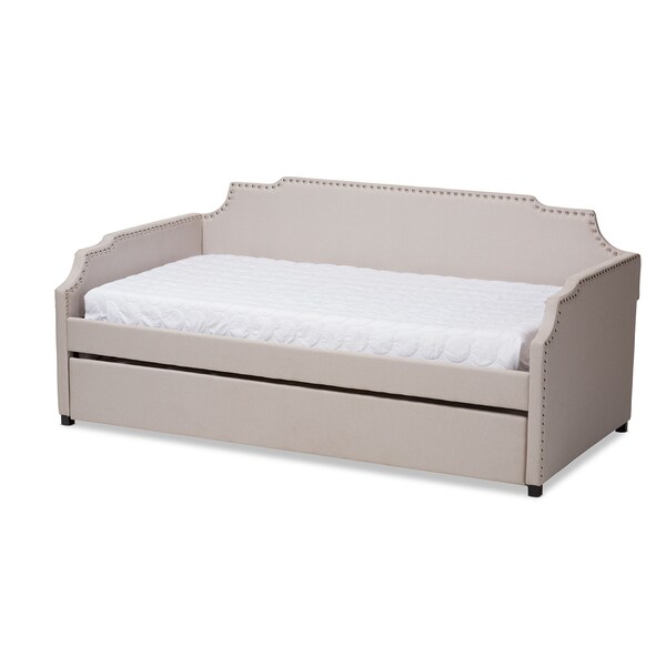 Featuring a roll-out trundle bed, the Ally daybed can easily transform any space from living room to bedroom. Constructed from solid rubberwood and MDF wood, the Ally is foam-padded and upholstered in an elegant neutral fabric for easy coordination with a wide range of color palettes. The daybed is fitted with a pull-out twin size trundle, providing convenient accommodation for guests. Designed with both function and style in mind, the daybed features an elegant cut-out frame accented with chrome nailheads for a touch of glamour. This dynamic piece for furniture will allow you to maximize your space without sacrificing style. The Ally requires assembly.