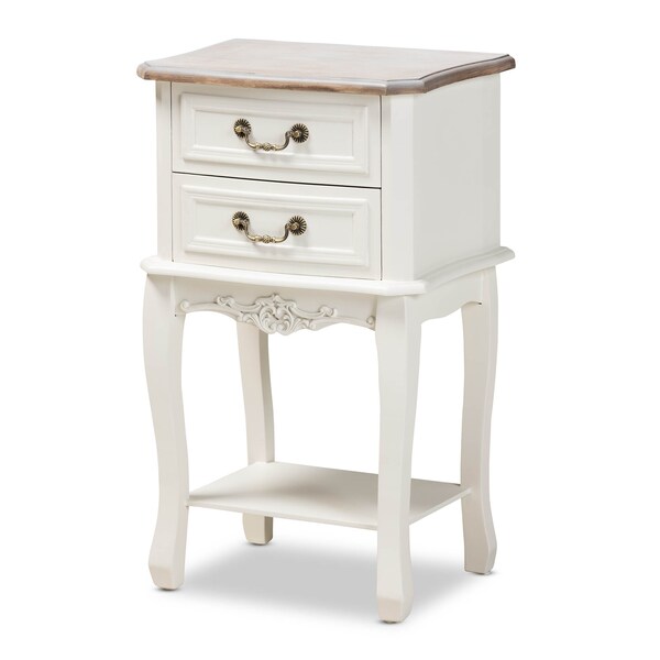 Enhance your bedroom with the charming Amalie nightstand. Constructed from wood, this nightstand pairs a white-washed oak tabletop with polished white drawers. The tabletop features space to place a lamp, while two drawers offer storage space for bedside knick-knacks. Each drawer is adorned with molding detailing and an elegant brass metal handle. Additional storage space is provided by an open shelf on the bottom. Inspired by French provincial furniture, the Amalie displays exquisite cabriole legs. The Amalie nightstand will arrive fully assembled.