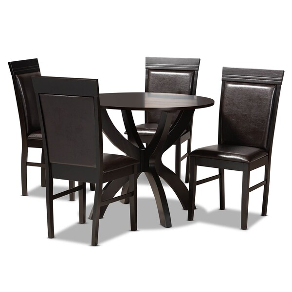 Clean lines and dark tones convey a modern elegance in the Ancel dining set. This wooden set includes one table and four chairs, each upholstered in a sleek dark brown faux leather that matches the dark brown wood finish. Designed with both comfort and style in mind, each chair features plush foam padding, as well as inset detailing on its back. The round tabletop is supported by an intersecting base, creating a chic, sculptural effect. Requiring assembly, the Ancel dining set is well suited for both casual and formal dining.