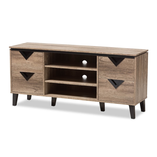 The Beacon media cabinet combines function and modern style. On a geometric silhouette, this oak veneered TV stand features four drawers with black triangle vinyl handles. The angled legs in black, supporting the media cabinet while contrasting with the oak veneered finishing showcase the modern look. Constructed of engineered wood, the TV stand is built to last. The TV cabinet comes with three open shelves with wire management cut-out on the back of the cabinet, enabling the storage of media players, games console and DVD while the drawers can be used as additional storage for controllers, manuals and anything that you would like to store away. The under clearance area allows you to dust as often to keep the area clean. The Beacon TV stand requires assembly.