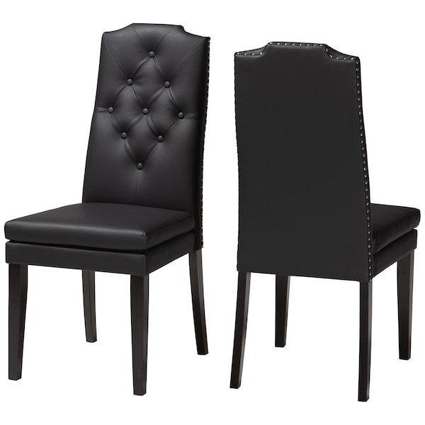 Elegant silhouette and luxurious appeal echo in the Dylin Modern and Contemporary Dining Chair. Upholstered in quality faux leather finished in black, the chair features delicate silver nail heads garnishing the edges. The backrest of the side chair presents a flowing curve, slightly bent outward, embedding a touch of grace. Constructed of solid rubberwood frame and upholstered throughout, the side chair will be a perfect choice for years to come. Double cushioning with foam and a wide seating surface, the dining side chair instantly upgrades the comfort level. The deep button-tufting backrest and the cut-out backrest reconfirm the modern and contemporary design elements. The Dylin requires assembly.