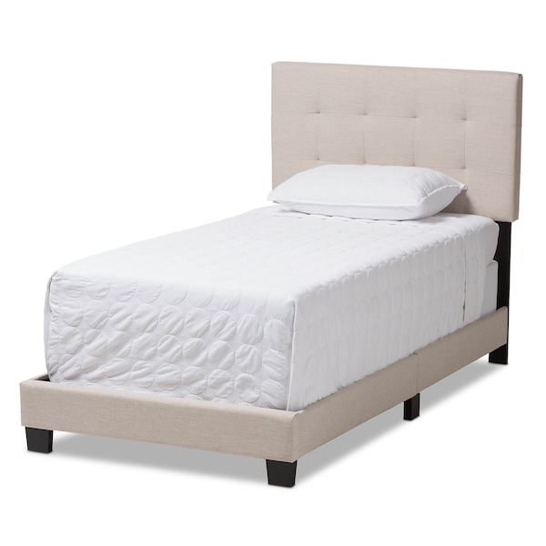 Stay and sleep in comfort with this Brookfield modern and contemporary beige fabric upholstered grid-tufting twin size bed. Crafted with style and characters, the bed features stylish grid-tufting design which can accommodate a twin sized mattress. Fitted with solid wood legs in black, the Brookfield provides stability and a stylish headboard. The entire headboard has been upholstered in high quality beige polyester fabric while grid-tufting design gives the piece a touch of sophistication. You'll love having this inside your bedroom. It offers comfort with a touch of delicate retro feel. The Brookfield requires assembly.