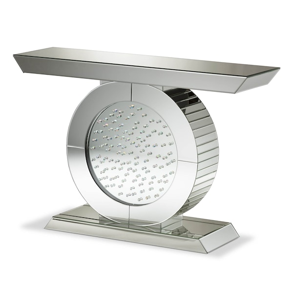 Sophisticated, graceful and elegant, the Cagney mirrored console table demonstrates style and restraint with its contemporary design. While elegantly reflecting its surroundings, the Cagney combines glamour with modernism. Shiny curves of this mirrored console table will dress up any room in your home. Light is captured and reflected from all surfaces of this art deco style table creating brightness and the illusion of space. The console is mirrored on both sides making it suitable for use in the center of a room as well as against a wall, making it a stunning entryway console table or occasional table behind a couch in the living room. Decorated with glass crystals, this beautiful piece of furniture is made of mirrored Glass and MDF. The Cagney will arrive fully-assembled.