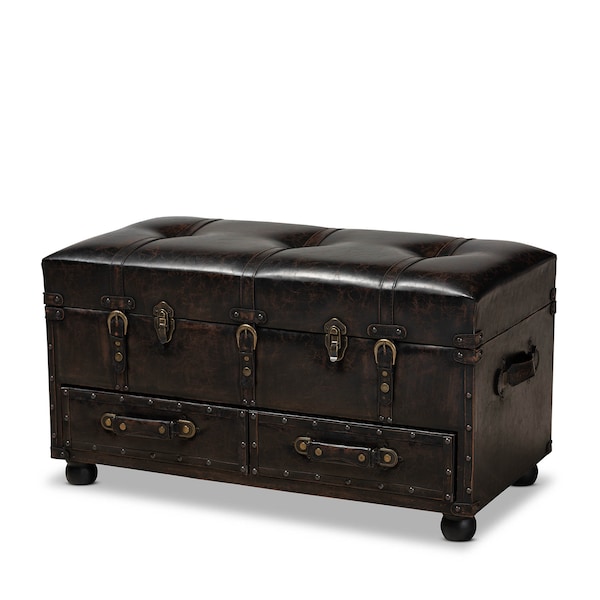 Stylish and versatile, the Callum ottoman is an easy addition to any space. Set on top of black bun feet, the Callum is upholstered in a distressed dark brown faux leather for an authentic antique look. Ample storage space is located beneath the cushioned lift-up lid, as well as in two drawers situated at the bottom. Inspired by vintage steamer trunks, the Callum is accented with antique brass buckles and latches. Antique bronze nailheads and button tufting add an extra dose of style. The Callum ottoman will arrive fully assembled.