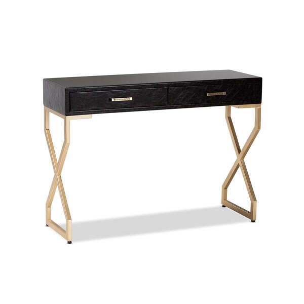 A stunning fusion of faux leather and metal make the Carville console table a unique addition to any space. This MDF wood console is upholstered in dark brown cracked faux leather for rugged charm. Two spacious drawers provide room to store phone chargers, bills, and more. A sturdy black glass tabletop is equipped with space to display books, decor, and more. The console is supported by a glamorous gold-finished metal frame that contrasts with the aged faux leather for a cool, contemporary feel. Inspired by both modern and ancient design, the Carville features gold-finished drawer handles embellished with the archaic Greek key motif. Place this exceptional piece in the foyer to create an impressive entrance, or place it in the living room to form a striking focal point. The Carville console table requires assembly.