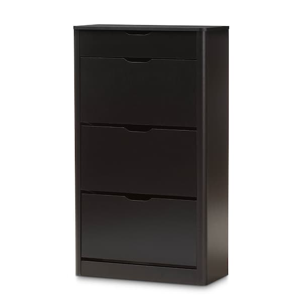 Update your everyday organization with the smart design and spacious drawers of the Cayla black shoe cabinet. Constructed of durable engineered wood for a sturdy structure with black finish for lasting good looks, the Cayla features soft-forming side panels outlook for a contemporary feel. One drawer space at the top is ideal for storing spare knick-knacks, deodorizers, and shoe-shine polishes. Three drawers with fold-down doors reveal angled compartments to easily access your shoes. Store up to 12 pairs of shoes for your convenience. Perfect for your entrance or bedroom for keeping sneakers, heels, and flats under wraps. The Cayla requires assembly.