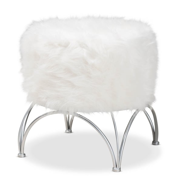 Celia White Faux Fur Upholstered Silver Metal Ottoman