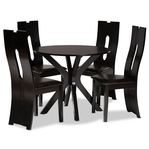 A harmony of modern comfort and style, the Cian dining set adds character to any space. The Cian is constructed from sturdy wood and includes four chairs and one table. Plush foam-padded seats covered by smooth faux leather provide a comfortable embrace while the circular tabletop allows for ample elbow room for each member of the table. Assembly is required and the darker tones of the Cian allow it to easily blend in with modern home layouts. A stylistic choice equipped with lavish comfort, the Cian dining set is an excellent addition to any home.