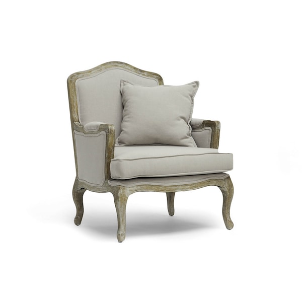 The Constanza French Living Room Chair will show you why French style has worked its way into the modern home. The distressed look of the antiqued finish exposed rubberwood frame is surprisingly versatile, fitting with like-minded traditional French furnishings as well as sleek modern and industrial styles. Similarly versatile is the neutral gray-beige linen upholstery, encasing comfy foam cushions. We recommend exclusively spot cleaning. The Constanza Designer Arm Chair requires assembly. Seat dimension: 18.5 inches high x 25 inches wide x 24 inches deep