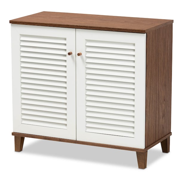 Store your shoes on the sly with the Coolidge shoe cabinet. Two slatted doors, fitted with round knobs, conceal four shelves with storage space for up to 12 pairs of shoes. Tapered legs add refined style and provide elevation to deter dust buildup. Constructed from engineered wood, the Coolidge showcases a cool two-tone white and walnut brown finish that complements any color scheme. The Coolidge shoe cabinet requires assembly.