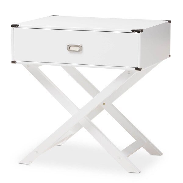 Display your novels in style by your bed and within reach by showcasing the wonderful Curtice bedside table. High-density medium density board base for a sturdy and durable quality with a white paint finish for smooth, resilient style. Design features one drawer with a fixed x- base for a lamp, books and bedroom articles. Metal brackets and handle pulls complete the look of a modern and contemporary style. The Curtice nightstand requires assembly.