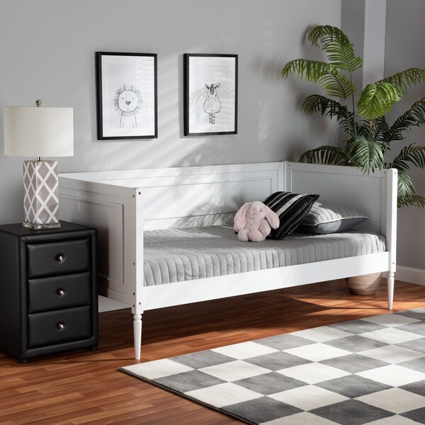 Set up a cozy escape in your home with the stunning design of the Daniella daybed. Made in Malaysia, this bed is constructed from sturdy wood showcasing a clean white finish. Inset paneling lends a crisp, modern look while turned legs add a classic touch. Requiring assembly, the Daniella utilizes wood slats for mattress support, which eliminates the need for a box spring. A cozy, refreshing addition, the Daniella daybed establishes a modern profile in any space.
