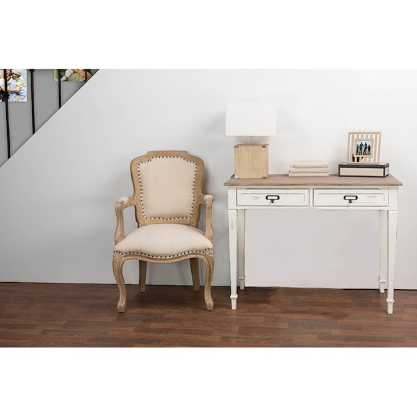 Boasting a white-streaked and distressed finish plus plenty of storage space, our Dauphine Traditional French Accent Writing Desk unifies fashion and functionality. The genuine mindi-wood top features a white-streaked natural veneer that pairs perfectly with the distressed white finishing that comprises the remainder of this writing desk. Black metal drawer handles offer attractive contrast. Superb value in a discount-furniture item.