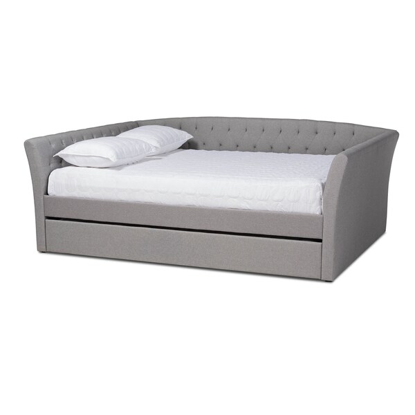A comfortable place to lounge or sleep, the Delora daybed brings versatility to any space. This wood daybed is upholstered in a soft, resilient polyester fabric and is padded with foam for the utmost comfort. Flared arms and elaborate button tufting lend a classic, refined look. Designed for both style and function, the Delora is fitted with a roll-out twin size trundle bed to provide convenient accommodation for overnight guests. The Delora daybed requires assembly.