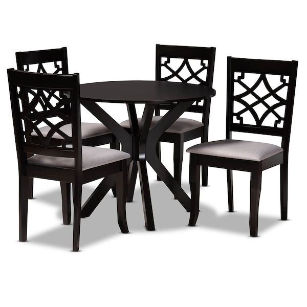 Elevate your dining space with the contemporary style of the Elena dining set. The Elena includes four dining chairs and one table constructed from sturdy wood and finished in a rich dark brown. Each chair is fitted with a foam padded cushion upholstered in smooth grey fabric and features a unique cut-out design on its back. Requiring assembly, the circular tabletop allows ample elbow room for each member of the table. Perfect for both casual and formal occasions, the Elena dining set easily modernizes any home.