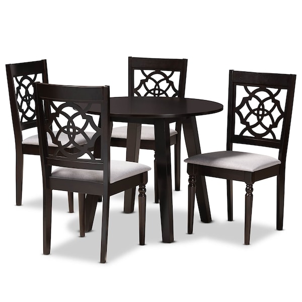 Elegant design marries quality craftsmanship in the Eliza dining set. This wooden set includes one table and four chairs, each upholstered in a light fabric that complements the dark brown wood finish. Designed with both comfort and style in mind, each chair features a plush foam-padded seat, as well as a striking cut-out design on its back. The round tabletop is supported by splayed legs, creating a stylish profile from any angle. Requiring assembly, the Eliza dining set elevates any dining experience.