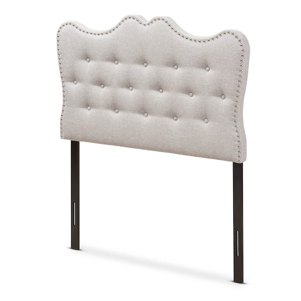 Classic curves, soft fabric, and sparkly metallic studs add a sense of glamour to your bedroom interior with the Emma contemporary headboard. Constructed of solid rubberwood frame, the Emma headboard is upholstered in greyish beige or dark grey polyester fabric that is durable. Featuring a curvaceous outline with button-tufted design for a classic look, the headboard is supported sturdily by solid wood posts and cushioned for added softness and shape, providing a comfortable leaning space while you sit up. The headboard requires assembly.