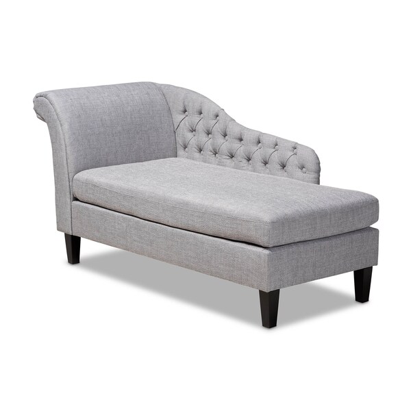 Lounge like royalty with the Florent chaise. This Victorian-inspired chaise features a graceful scroll back and single arm with lavish button tufting. Designed to add both elegance and function to your space, the Florent is crafted from sturdy wood and upholstered in a soft, foam filled fabric for the utmost relaxation. The chaise is set on top of tapered, black finished legs, adding a modern twist to this classic chaise. The Florent chaise requires assembly.