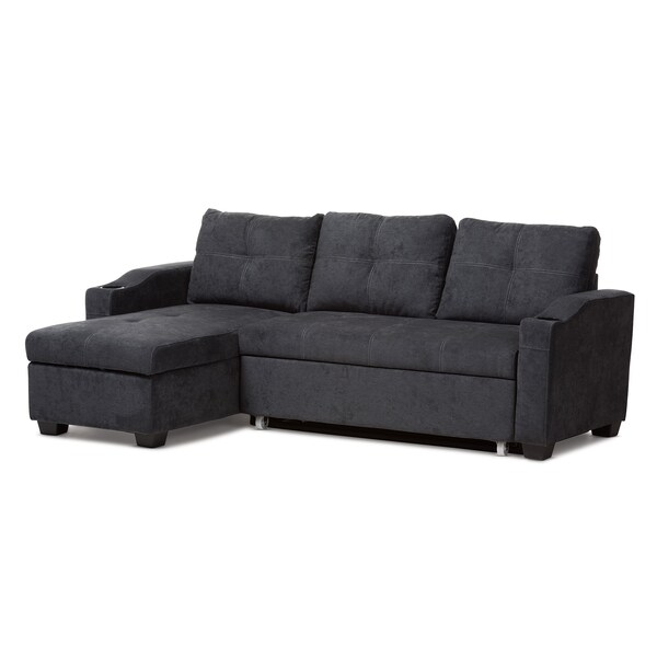 The Lianna sectional sofa has all the right features to meet the needs of modern life. This modern and contemporary-inspired sectional sofa is built to last with wood and metal construction. The Lianna is upholstered in dark grey fabric and comes with removable cushions. The regular seating of the sofa pulls out to give you more legroom or serve as a guest bed. The Lianna features a reversible chaise, which also lifts to reveal storage, perfect for linens, pillows, or whatever else is cluttering the livingroom. The Lianna was made for convenience, featuring cloth handles for the lifting and pulling, as well as cup holders on each arm. Bring comfort, storage solutions, and functional style home with this sectional sofa. The Lianna requires assembly.