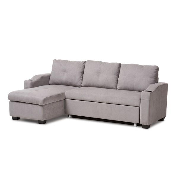 The Lianna sectional sofa has all the right features to meet the needs of modern life. This modern and contemporary-inspired sectional sofa is built to last with wood and metal construction. The Lianna is upholstered in light grey fabric and comes with removable cushions. The regular seating of the sofa pulls out to give you more legroom or serve as a guest bed. The Lianna features a reversible chaise, which also lifts to reveal storage, perfect for linens, pillows, or whatever else is cluttering the livingroom. The Lianna was made for convenience, featuring cloth handles for the lifting and pulling, as well as cup holders on each arm. Bring comfort, storage solutions, and functional style home with this sectional sofa. The Lianna requires assembly.