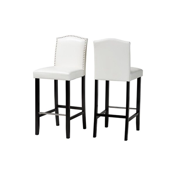 The look of nail head-studded faux leather pairs beautifully with a contemporary update in the lust-worthy Libra Designer Bar Stool. The simple silhouette of this contemporary bar stool is made with a solid rubber wood frame, foam cushioning, iron spring supports, and a stainless steel foot rest. White faux leather pairs with a dark brown frame and non-marking feet for the win. To clean, wipe with a damp cloth. The Libra Stool requires assembly and a rubber mallet. Brown and Black faux leather options are also available sold separately. 18.5WX21.5DX44.5H