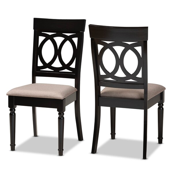 Enhance your dining space with the elegance of the Lucie dining chair. The Lucie is constructed from solid oak wood and showcases a rich espresso brown finish that complements the light polyester fabric upholstery. Designed with both comfort and style in mind, the Lucie features a plush foam-padded seat, as well as an exquisite cut-out design on its back. The Lucie dining chair comes in a pack of two and requires assembly. Turned legs add a classic, refined touch.