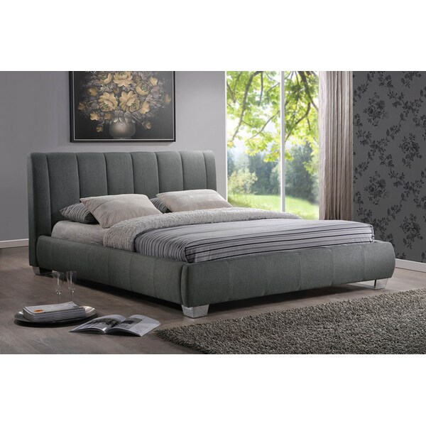 Gentle contouring combines with eye-catching vertical headboard stitching to create our Marzenia Wood Contemporary Queen-Size Bed. This contemporary platform bed includes a wood frame and grey linen-like fabric for a refined, yet forward-looking experience. Reflective, chrome feet keep things firmly modern. This discount bedroom-furniture item is the stuff of dreams.