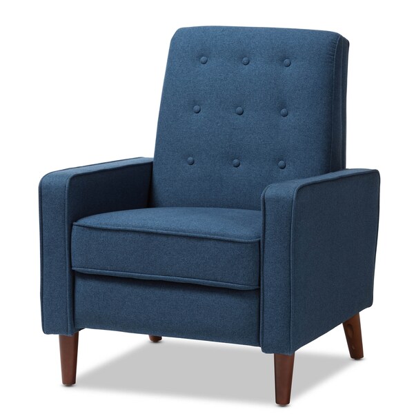 Sit back and relax in style with the Mathias recliner. The Mathias recliner's modern and contemporary-inspired look exemplifies the minimalist chic of modern design. Constructed with sturdy hardwood and plywood, this chair is built to last. Enjoy comfort with the chair's reclining back, raiseable footrest, and hidden steel push-back mechanism. The Mathias features blue fabric, button-tufted upholstery over foam padding, making this a cozy addition to your living room, home office or entertainment room. Walnut-finished eucalyptus legs complete the sophisticated style of the Mathias. This recliner requires assembly.