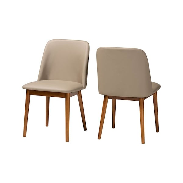 Mid-Century dining chairs are a perfect idea for any home decoration, the Lavin Mid-Century dining chairs furniture set includes 2 beige dining chairs. The chairs feature wide cushioned seat and sloping back, made with upholstered in beige faux leather and supported by walnut finished solid spindly and smooth wood legs, which designs a beautiful classic dining atmosphere.