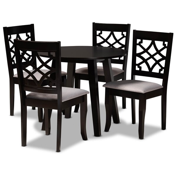 Elevate your dining space with the contemporary style of the Mya dining set. The Mya includes four dining chairs and one table constructed from sturdy wood and finished in a rich dark brown. Each chair is fitted with a foam padded cushion upholstered in smooth grey fabric and features a unique cut-out design on its back. Requiring assembly, the circular tabletop allows ample elbow room for each member of the table. Perfect for both casual and formal occasions, the Mya dining set easily modernizes any home.